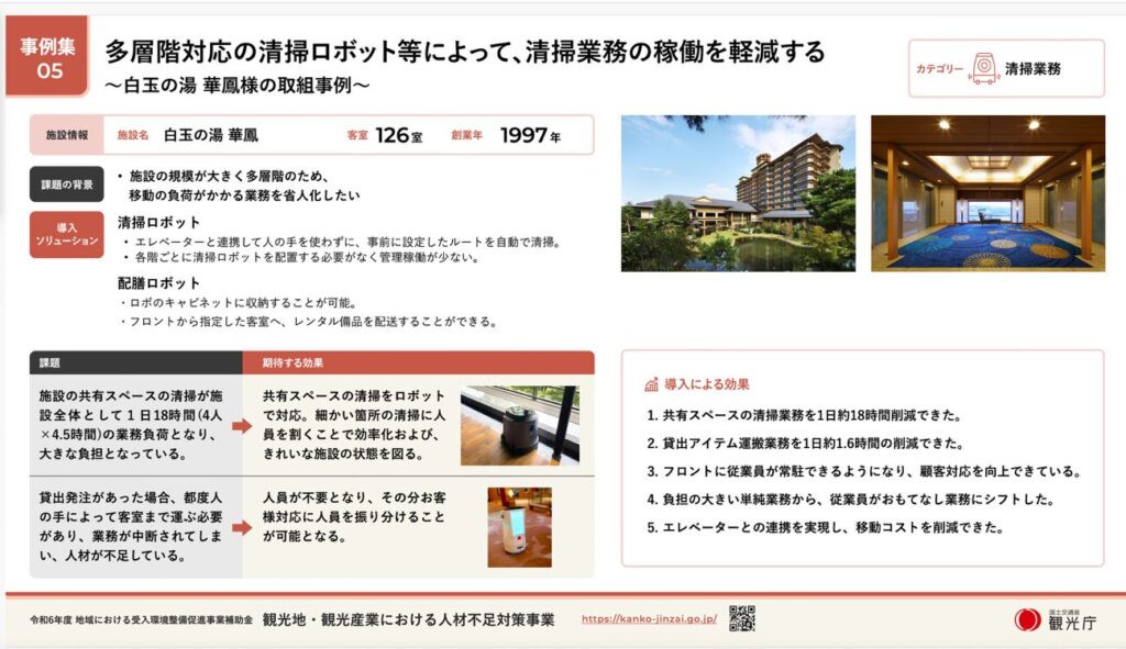 エイム・テクノロジーズの配送ロボットNAOMI、清掃ロボットKIRARAとエレベータ連携を組み合わせたシステムが導入された新潟月岡温泉の白玉の湯 華鳳が観光庁の人材不足対策事業の事例として2026年2月25日26年度公募要領とともに観光庁のWEBにアップされました。