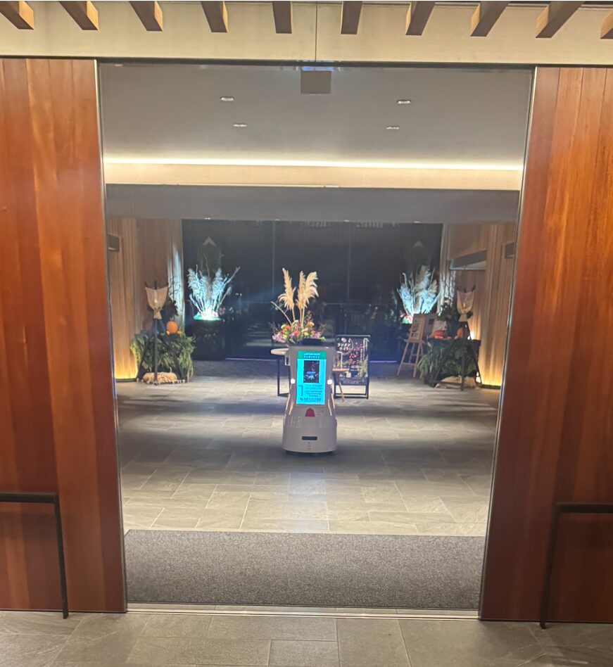 箱根の藤田観光の小涌園ホテルでは、NAOMIが2台導入されておりロビーで歓迎メッセージをサイネージに出してお客様を歓迎しておりインバウンドのゲストを部屋まで案内したり、アメニティをエレベータ経由で運んだりしております。加えて夜間の見回りもできるシステムも提供しております。
